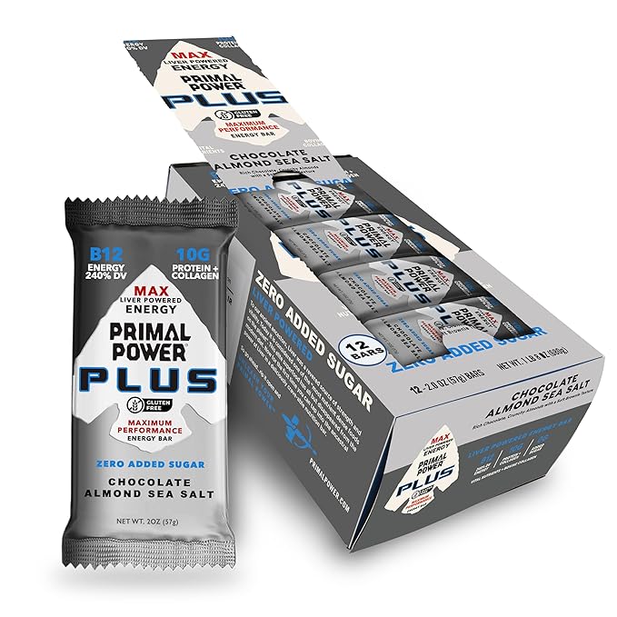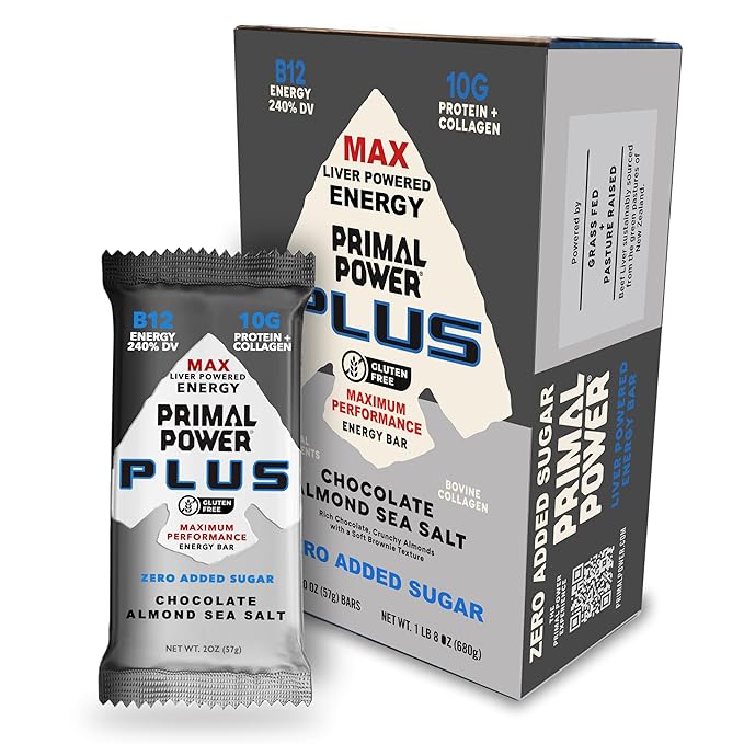 Primal Power Plus Liver Powered Nutrition Bars - B12 Energy Boost, 10g Protein, Vitamins, Minerals, Collagen, Zero Added Sugar, Gluten Free - Pack of 12 (Chocolate Almond Sea Salt Flavor)