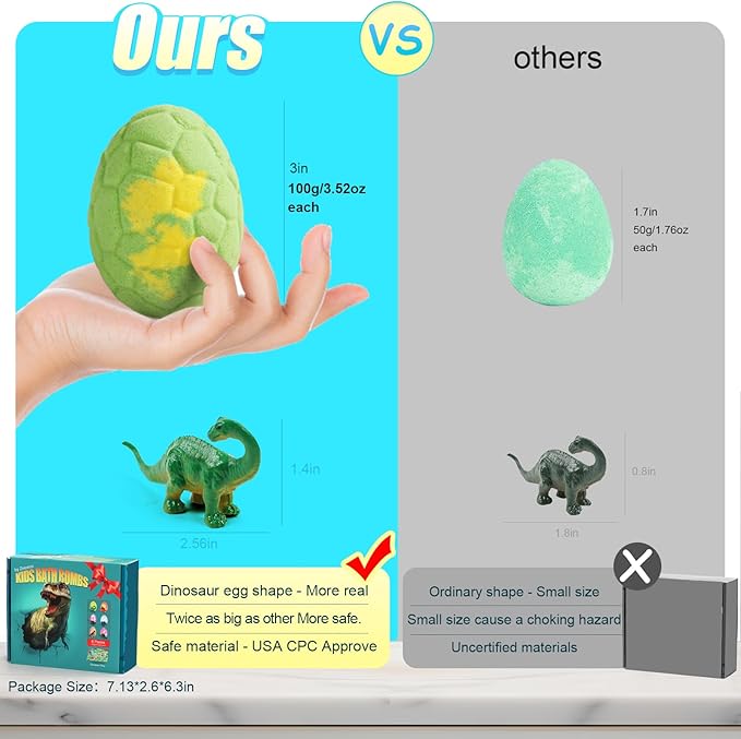 - 🦖【Bath Bombs with Toys Inside】Each bath bombs for kids contains a different dinosaur toy inside. Our dinosaur toys are made of safe material and also passed U.S. Toy Safety Testing for Kids Products. These dinosaur toys do not cause choking hazard and can also be used for collection, make children recognize ancient creatures and cultivate children’s imagination. So this bath bombs gift set will bring experience for boys and girls the best surprises when bathing time.A surprise choice for putting stocking stuffers in for the kids.