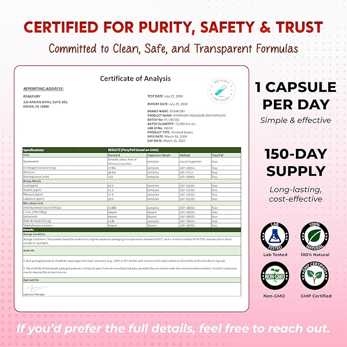 - High-quality Collagen Supplement: Non-GMO, soy, dairy, gluten, filler, preservative, flavor, and tree nut-free. Ingredients rigorously tested for safety, purity, potency by third-party labs.