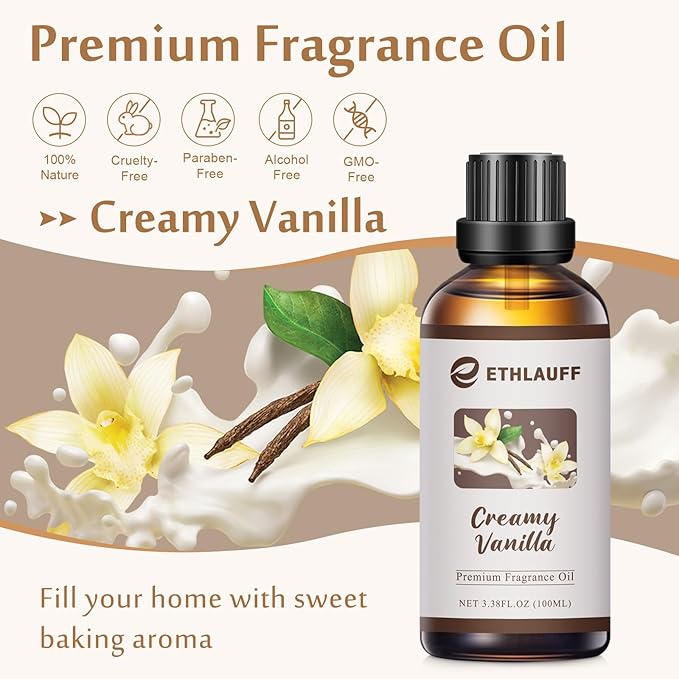 Creamy Vanilla Essential Oil, 100ml Vanilla Fragrance Oil, Aromatherapy Oil for Candle/Soap Making, Massage -3.38FL.OZ