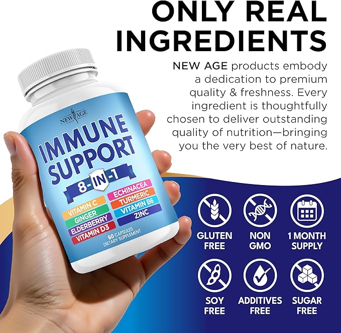 - Packed with Vitamin C & Vitamin D – 100mg of Vitamin C Supplement and Vitamin D 5000 IU which are both known to be high in antioxidant support and essential vitamins that your body is unable to produce naturally. Vitamin C with Zinc for Adults is more than the average Vitamin C Capsule or Vitamin D Capsules. New Age 8-in-1 capsules make it effortless to get the immune supporting benefits you need.