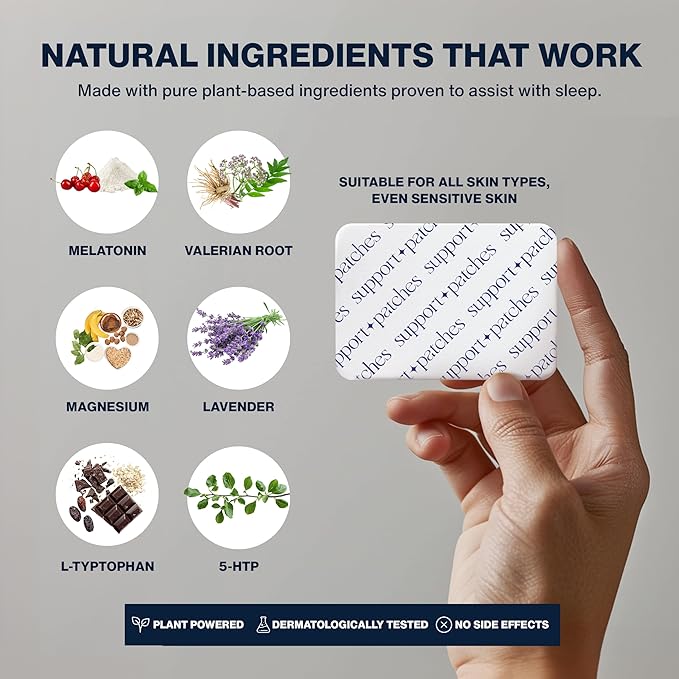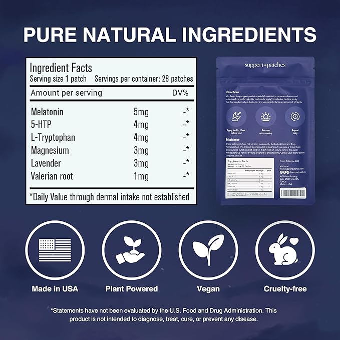 - NATURAL INGREDIENTS – Our sleep patches contain only high-quality ingredients: Melatonin, Magnesium, Valerian Root, 5 HTP, L Tryptophan, and Lavender. It’s a natural sleep supplement that combats sleeplessness, stress, and worries. Made in the USA.