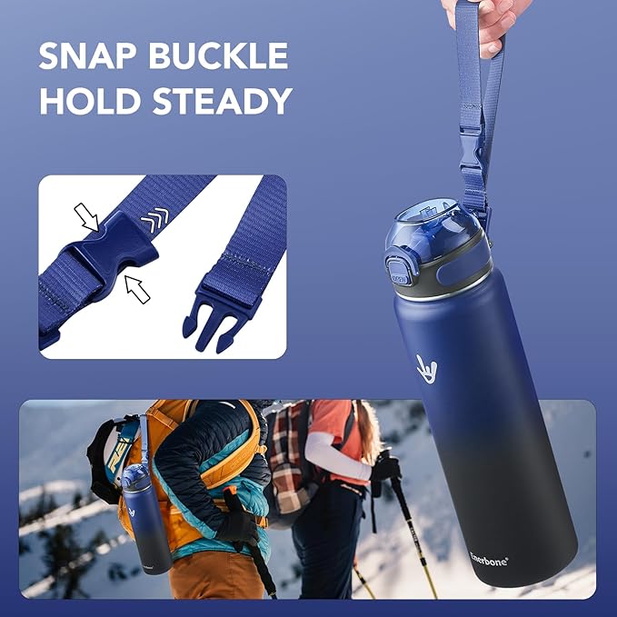 - Easy Travel: With its generous 32 oz capacity, the water bottle with snap buckle is perfect for all your outdoor adventures, such as hiking, camping, and sporting events. Stay hydrated and enjoy your journey hassle-free with this versatile companion.