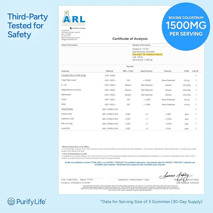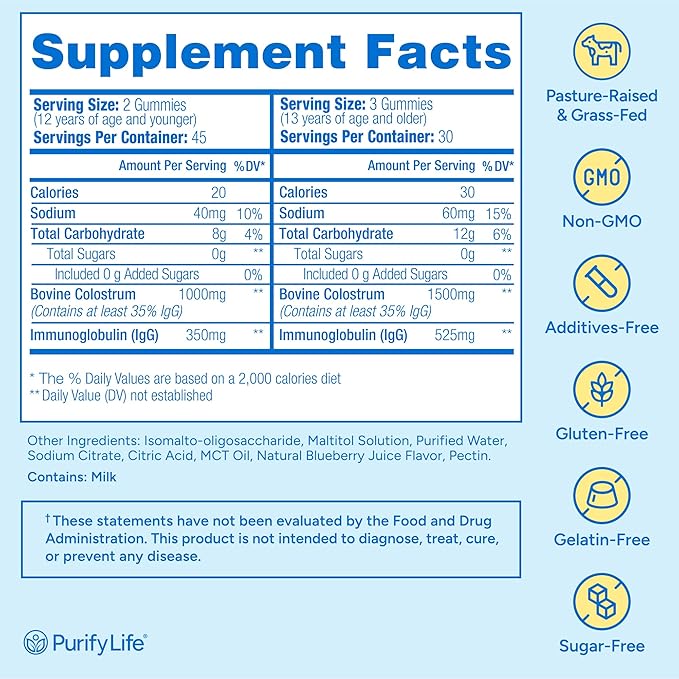 - [First Milking Colostrum Infused Gummies] - Purify Life’s colostrum supplement gummies are infused with colostrum sourced exclusively from the initial milking, ensuring peak potency and superior quality in every chew.