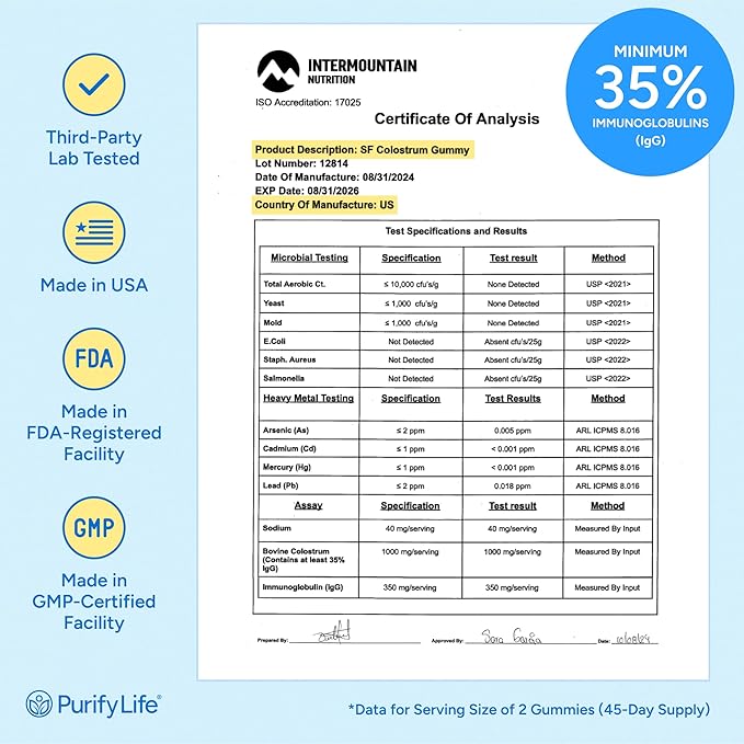 - [35% IgG - High Potency Content] – Purify Life colostrum gummies for adults feature a potent 35% IgG concentration, delivering powerful support for immune function and overall health with every delicious serving.