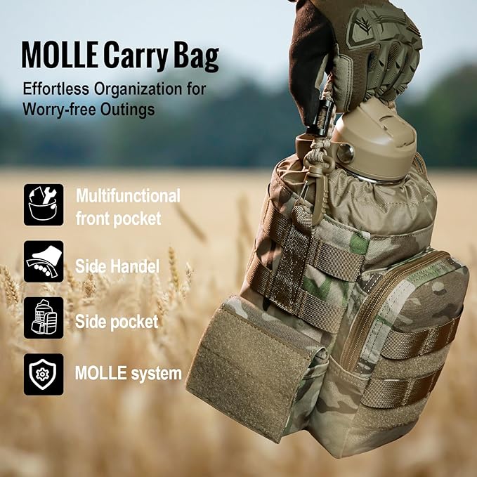 - The Complete Hydration Solution: Elevate your hydration experience with our water bottle and included accessories. From 3 different lids and 2 straws for versatile use with any beverage, to a cleaning brush for easy maintenance, we've got you covered. Plus, our tactical water bottle also comes with a spacious bag and paracord handle that can be worn crossbody or carried by hand, with extra pockets for storing small items you need for the day such as cell phones, keys, and cion or cash.