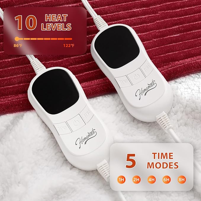 - 【EASY TO USE】: Homemate heated blanket queen size have 10 heat levels,1/2/4/6/8 hours auto shut off. Temperature range is 86-122°F.Very convenient to use,even the elderly,the sick,and the disabled can use it easily.Power Cord is 16.7 feet,this long cord makes the use of the blanket more flexible,can be used on the bed,on the sofa,can be used in the study and office, very convenient.