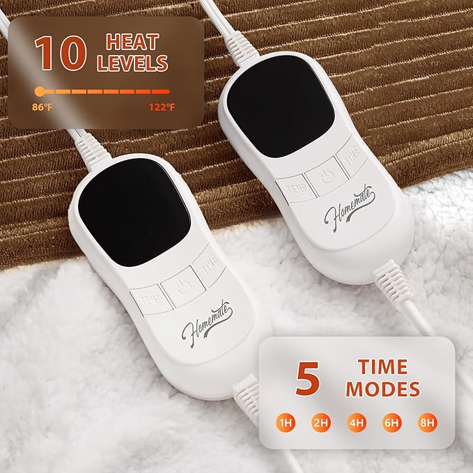 - 【EASY TO USE】: Homemate heated blanket queen size have 10 heat levels,1/2/4/6/8 hours auto shut off. Temperature range is 86-122°F.Very convenient to use,even the elderly,the sick,and the disabled can use it easily.Power Cord is 16.7 feet,this long cord makes the use of the blanket more flexible,can be used on the bed,on the sofa,can be used in the study and office, very convenient.
