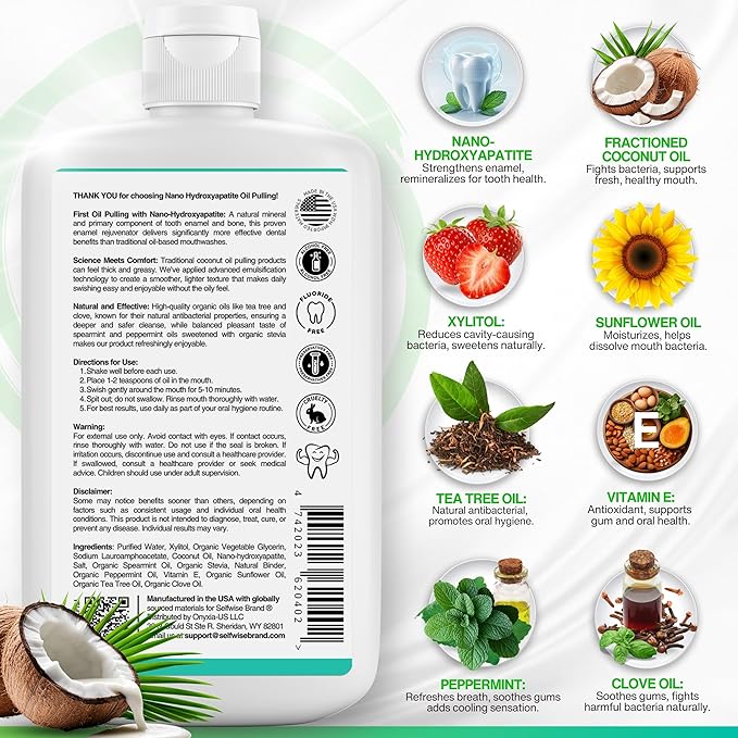 - NANO HYDROXYAPATITE OIL PULLING MOUTHWASH - The first-of-its-kind oil pulling mouthwash infused with Nano Hydroxyapatite, a natural mineral known to support enamel strength and leave your mouth feeling clean and refreshed. Enjoy a modern approach to ancient oil pulling without the greasy feel
