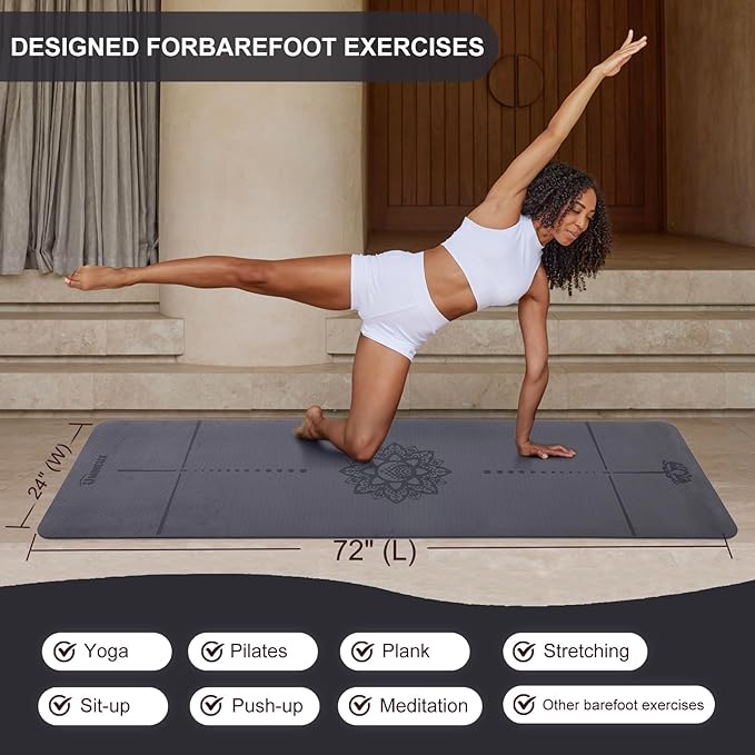 - Upgraded TPE Material: Crafted from premium TPE material, this big home gym mat is free from phthalates and has no unpleasant smell. Compared to NBR and PVC mat, TPE has a nice density. It provides ample cushioning without excessive sinking, aiding in the maintenance of balance during your practice