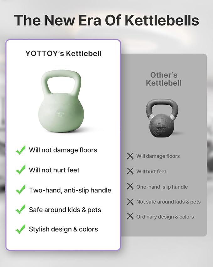 - Shock-Absorbing Soft Kettlebell Base: Our YOTTOY soft kettlebell features a sand-filled base to reduce impact, protecting your floors while minimizing noise. This makes it an ideal choice for strength training kettlebells, ensuring a safe and comfortable workout experience