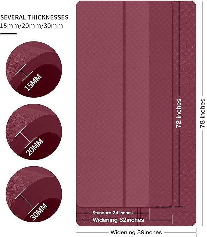 - ๐นEXTRA LONG EXTRA WIDE: nuveti's 72"x32"/78"x36" offers adequate space to fit any type of exercise like yoga, pilates, bikram, and fitness exercise.Most yoga mats on the market are 6mm, 8mm or even thinner. This yoga mat is thickened to 15mm,20mm,30mm which can provide more support and protection for your ankle, knees, joints, and body on hard floors, as well as absorbs vibration and reduces noise.