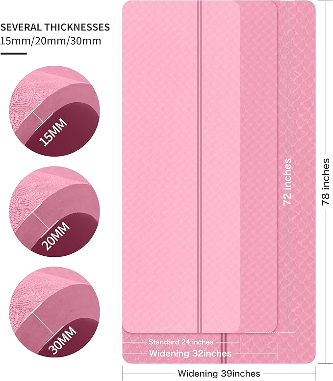 - ๐นEXTRA LONG EXTRA WIDE: nuveti's 72"x32"/78"x36" offers adequate space to fit any type of exercise like yoga, pilates, bikram, and fitness exercise.Most yoga mats on the market are 6mm, 8mm or even thinner. This yoga mat is thickened to 15mm,20mm,30mm which can provide more support and protection for your ankle, knees, joints, and body on hard floors, as well as absorbs vibration and reduces noise.