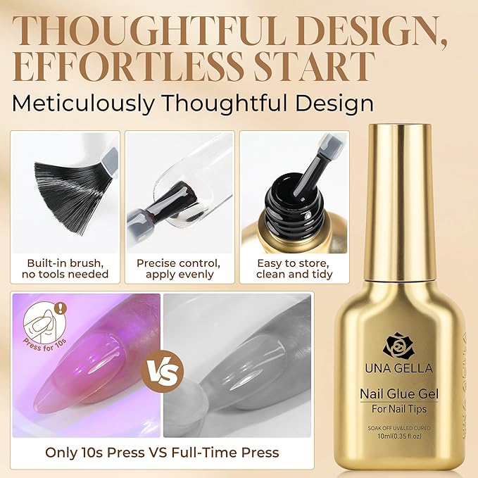 - 🎉【Suit All Kinds of Tips】UNA GELLA gel nail glue is compatible with all brands of soak-off gel nail polish. Suitable for natural nails, nail lamp gel nails, artificial nails, acrylic nails, nail tips, etc