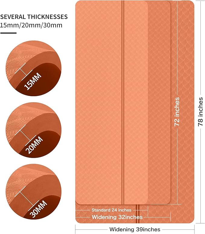 - ๐นEXTRA LONG EXTRA WIDE: nuveti's 72"x32"/78"x36" offers adequate space to fit any type of exercise like yoga, pilates, bikram, and fitness exercise.Most yoga mats on the market are 6mm, 8mm or even thinner. This yoga mat is thickened to 15mm,20mm,30mm which can provide more support and protection for your ankle, knees, joints, and body on hard floors, as well as absorbs vibration and reduces noise.