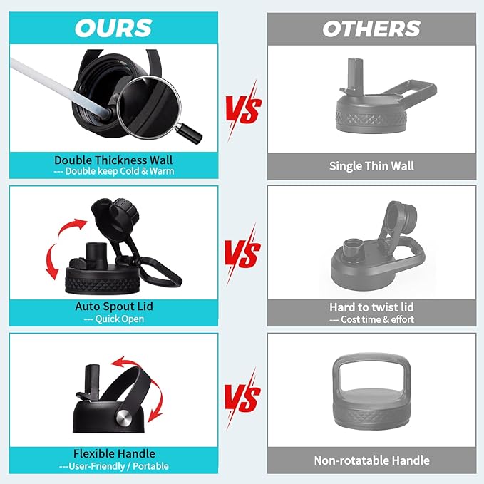 - LEAK-PROOF 2 LIDS - AUTO SPOUT LID & STRAW LID allow you enjoy spill-proof sipping and fast drinking to meet your different drinking needs. The pop-up spout lid is designed for one-hand open and close, with a large water outlet for fast drinking. The spill-proof straw lid makes you easy sip on the go, great to all your outdoor adventures, and also prevent the inhalation of ice cubes