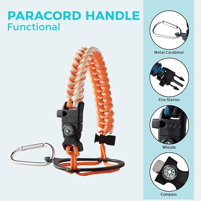 - PERSONALIZATION BOTTLE PARACORD HANDLE - Quarter gallon water bottle with a pretty cool functional paracord handle which does more than meets the eye.?The survival strap cord is made of military-grade nylon and comes with a compass, safety loop, metal carabiner, flint, igniter, and whistle, making it a functional and stylish addition to your thermo water flask, is perfect for outdoor camping, hiking, fitness enthusiasts