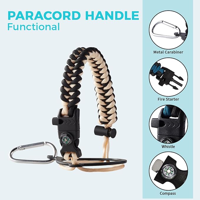 - PERSONALIZATION BOTTLE PARACORD HANDLE - Quarter gallon water bottle with a pretty cool functional paracord handle which does more than meets the eye.?The survival strap cord is made of military-grade nylon and comes with a compass, safety loop, metal carabiner, flint, igniter, and whistle, making it a functional and stylish addition to your thermo water flask, is perfect for outdoor camping, hiking, fitness enthusiasts