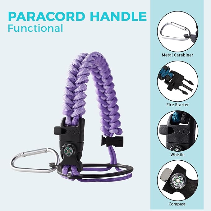 - PERSONALIZATION BOTTLE PARACORD HANDLE - Thermo water bottle with a pretty cool functional paracord handle which does more than meets the eye. The survival strap cord made of military grade nylon, with compass, safety loop, metal carabiner, flint, igniter and whistle. Can help you out if you were in a survival situation while hiking, camping or everyday life