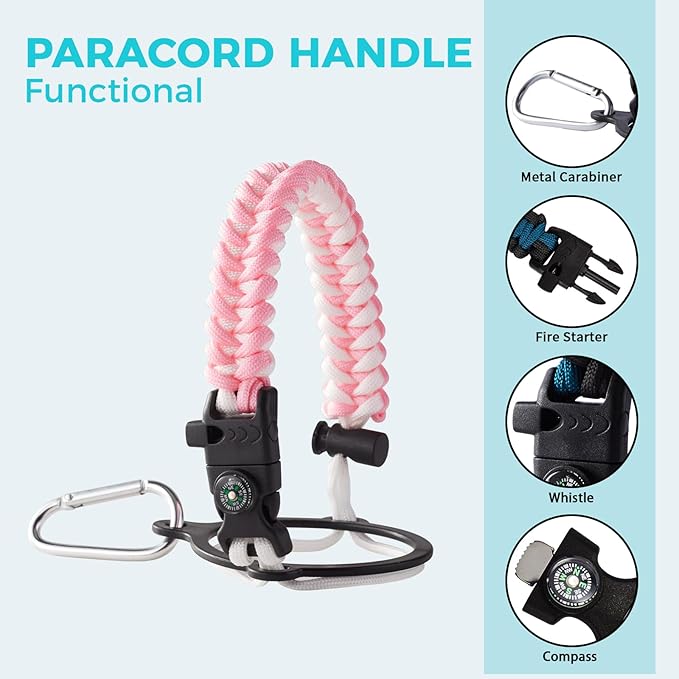 - PERSONALIZATION BOTTLE PARACORD HANDLE - Thermo water bottle with a pretty cool functional paracord handle which does more than meets the eye. The survival strap cord made of military grade nylon, with compass, safety loop, metal carabiner, flint, igniter and whistle. Can help you out if you were in a survival situation while hiking, camping or everyday life