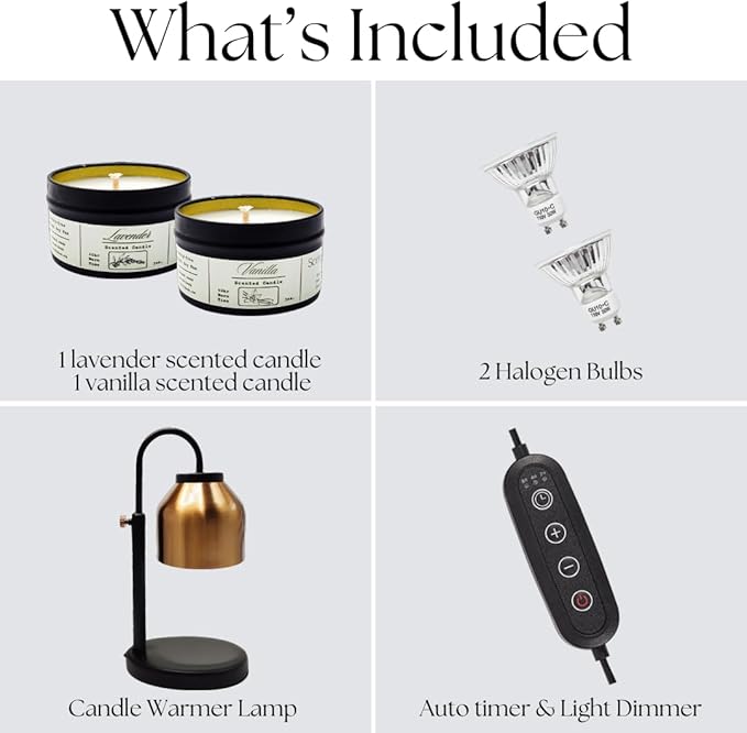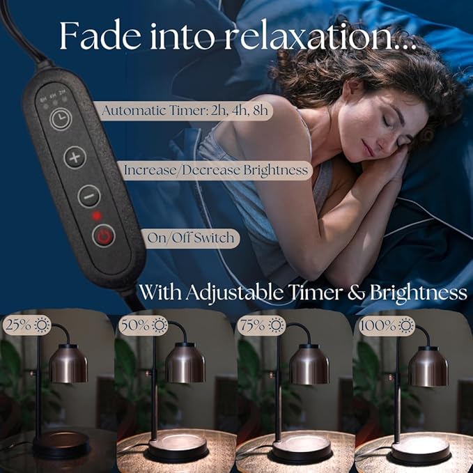 - ADJUSTABLE BRIGHTNESS: Our heat lamp is equipped with an adjustable dimmer heater switch that lets you control the brightness, candle melting speed, and fragrance concentration. Choose between 2H, 4H, and 8H options and rest peacefully knowing the lamp will turn off automatically.
