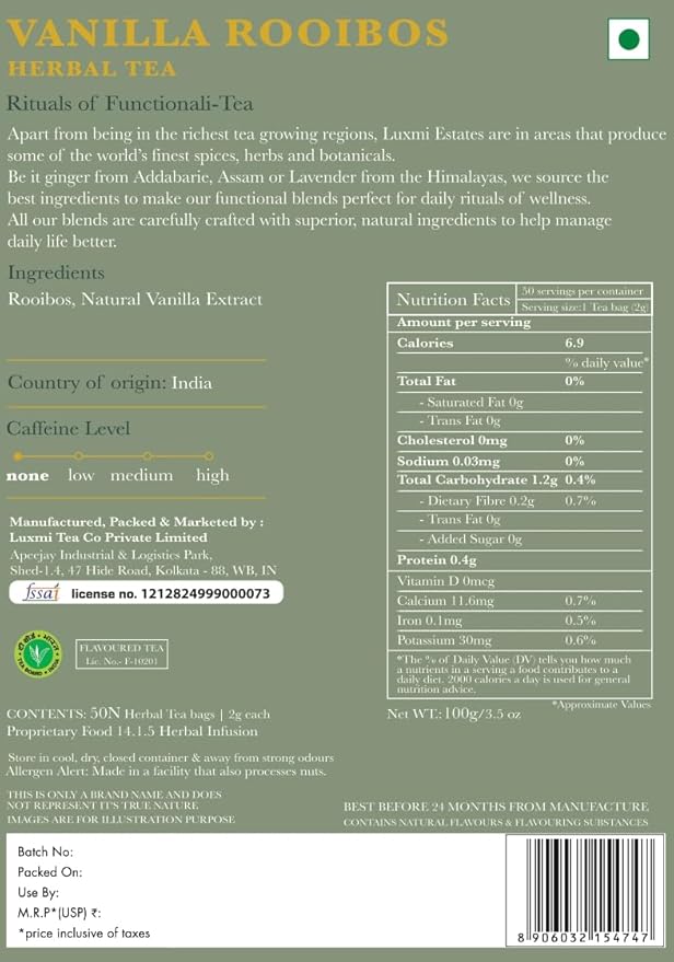 - Quality Ingredients: Discover the essence of South African charm with our Rooibos Vanilla Tea. Sourced exclusively from the pristine landscapes of South Africa, this exquisite herbal infusion combines the robust flavors of rooibos with the delicate sweetness of vanilla, creating a symphony of taste that is both soothing and satisfying.
