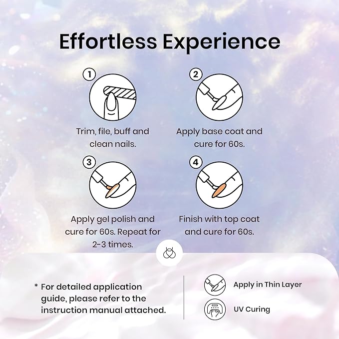 - Easy Application and Long lasting: Gel polish is long lasting for 28 days with perfect shine under proper application - With base gel top coat under the full application Process. Highly recommend a minimum of 60-120 seconds with a Uv Led light.