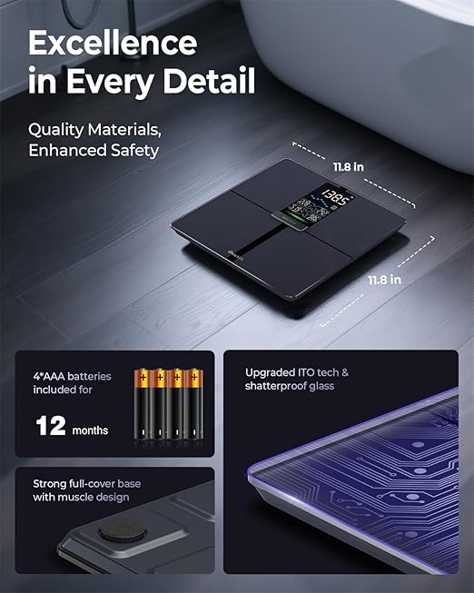 - Wider Platform & Safe Design: Our sturdy 11.8x11.8" scale, with a 450 lb capacity, features a full-cover base for stability, anti-slip pads, and shatterproof tempered glass for unmatched safety and durability