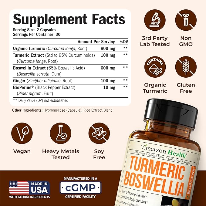 - POWERFUL JOINT SUPPORT SUPPLEMENT – A premium Turmeric Supplement with Boswellia Extract, and Ginger Root to support healthy joints, mobility, and flexibility. Formulated with ingredients known to be gentle on the stomach. 2-pack for a convenient 2-month supply (120 capsules).*