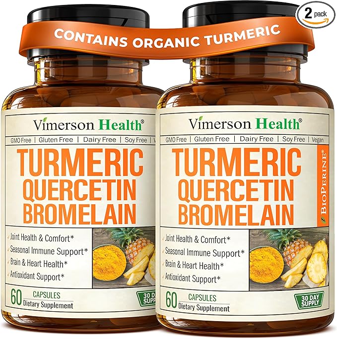 - Product Benefits : Boosts immune defenses with turmeric curcumin and bromelain, protecting against harmful free radicals.*, Enhances joint mobility and comfort naturally with turmeric, quercetin, and bromelain for daily support.*, Improves nutrient absorption with black pepper extract, delivering maximum benefits in every dose.*, Promotes an active lifestyle by reducing joint discomfort, perfect for outdoor and fitness enthusiasts.*, Supports digestive health with a vegan, non-GMO formula that is gentle on the stomach.*, Supports immune function and seasonal allergies with antioxidant-rich quercetin for year-round wellness.* Boosts immune defenses with turmeric curcumin and bromelain, protecting against harmful free radicals.*, Enhances joint mobility and comfort naturally with turmer… See more