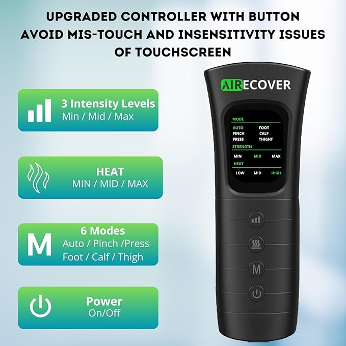 - Premium Massage and Heat: The AIRECOVER Heat and Air Leg Massager is a powerhouse. Heat therapy helps improve blood flow, reducing fatigue and enhancing circulation.