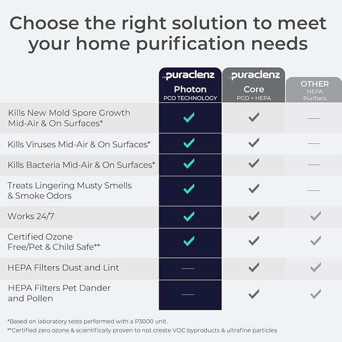 - ADVANCED MOLD DEFENSE – The Puraclenz Photon stops new mold spore growth in the air and on surfaces with a 99.75% success rate against candida albicans – the common cause of fungal infections – on surfaces. In addition, it reduces odors and mycotoxins, byproducts of mold, that can have long-term health effects by reducing new mold growth. *This product is designed as a preventative product and not for remediation.