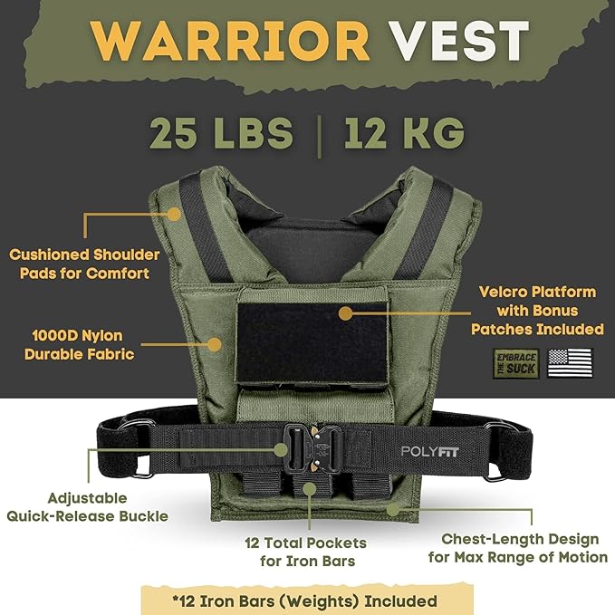 Polyfit (Warrior) Adjustable Weighted Vest - 25lb | 35lb | 45lb - Weight Vest with Adjustable Iron Weights for Men and Women for Workouts, Strength Training, Rucking