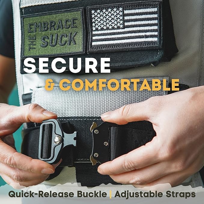 - 【QUICK-RELEASE BUCKLE FOR SECURE FIT] Our adjustable weighted vest features a quick-release buckle for easy on and off, cushioned shoulder pads for added comfort, and adjustable straps to fit all body types, ensuring the vest stays securely in place during any activity.