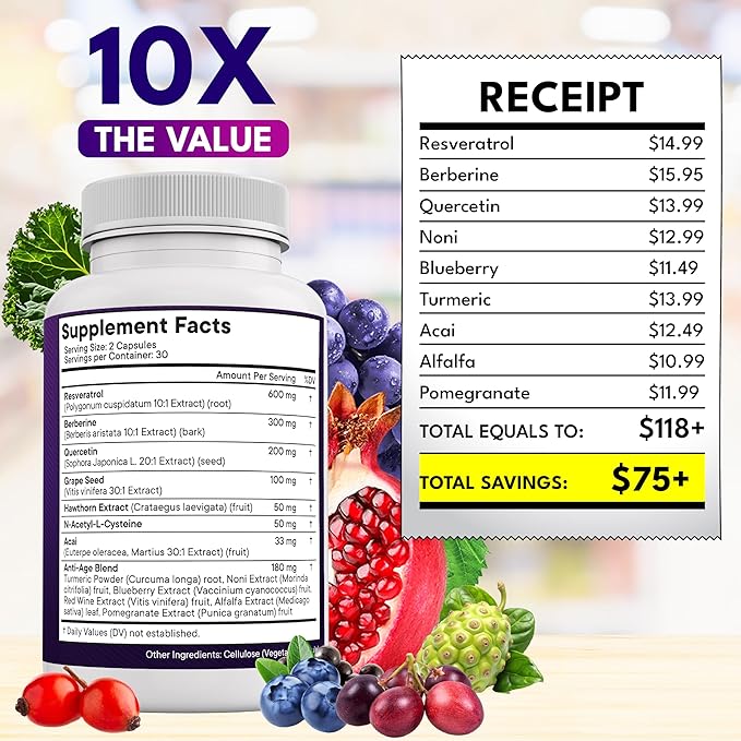 - Our Promise & Trusted Ingredients - Our Resveratrol All in 1 supplement combines the benefits of grape seeds, a quercetin with nac supplement and more. Our All in 1 blends are proudly made in a registered and certified facility. Other similar products offer only a few ingredients like trans resveratrol and Berberine. However, these all in 1 capsules has 13 powerful ingredients.