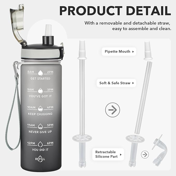 - 【Two Ways to Drink】Through the upgraded, motivational water bottle has two ways to drink. Equipped with a direct drinking port, drinking water is more enjoyable. One removable straw allows you to enjoy spill-proof sipping.