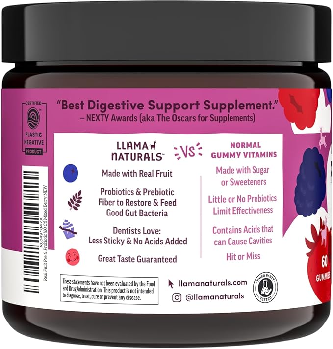 - PROBIOTIC AND PREBIOTIC: Most adult probiotics don’t include prebiotics, which may make them less impactful! Llama Naturals' formula uses probiotics and prebiotics making our vitamin gummies more effective. This is because while probiotics restore good components in your belly, prebiotics feed these components, helping them thrive.