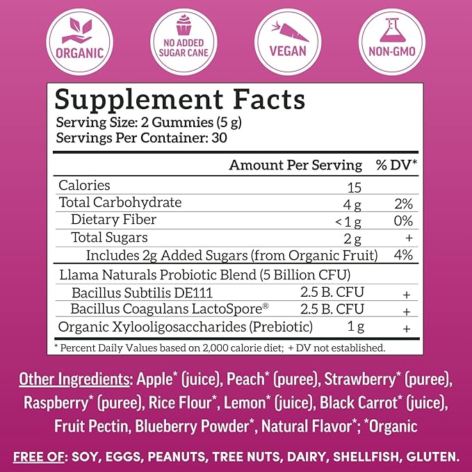 Llama Naturals Probiotics for Women and Men with Prebiotic Fiber, Vegan, Organic, Probiotic Gummies for Gut Health Support, Adults Real Fruit Gummy Vitamins, No Added Sugar Cane, Mixed Berry, 60 Ct
