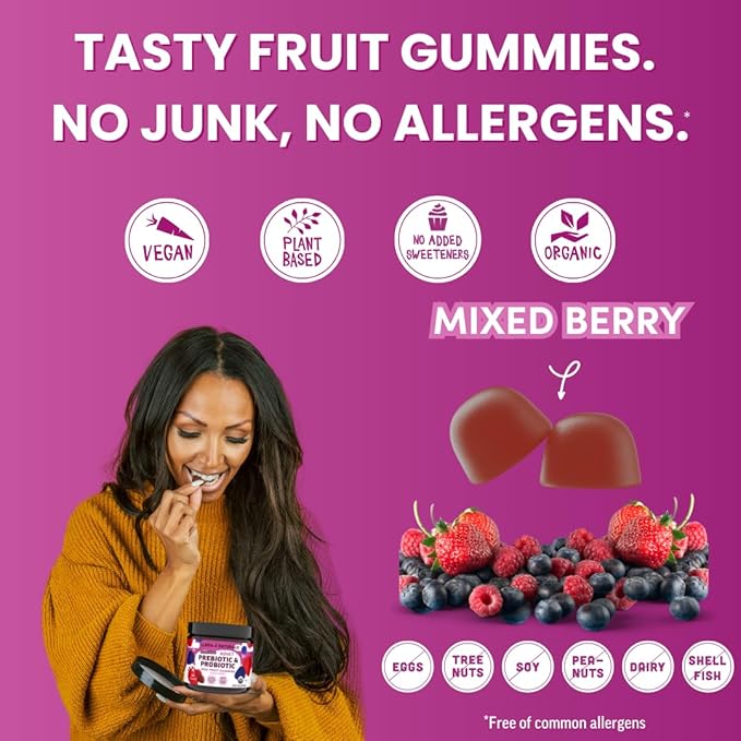 - NO JUNK OR ALLERGENS: Our probiotics for women and men are made of real organic fruit with no added sugar cane, syrups, sweeteners, synthetic vitamins, gelatin, artificial ingredients and colorings. These probiotic gummies are also plant based, vegan, and contain no peanuts, tree-nuts, corn, gluten, soy, dairy, eggs, or shellfish.