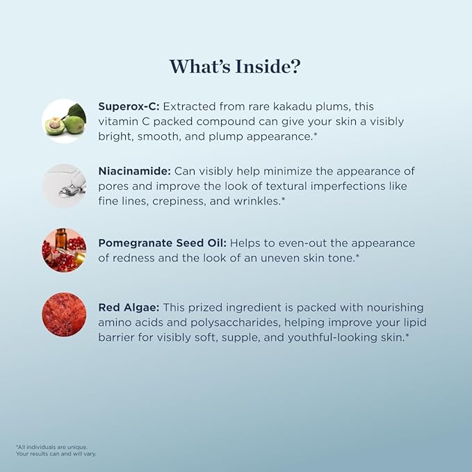 - PREMIUM INGREDIENTS: Each drop is packed with skin-beautifying agents, including Superox-C, Niacinamide, Pomegranate Seed Oil, and Red Algae.