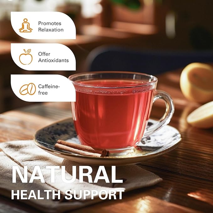 - 【Without Black Tea】Cinnamon Apple Tea Bags are a perfect blend of cinnamon, hibiscus, natural apples and cinnamon flavoring. All the ingredients are honestly stated, with no added sweeteners!