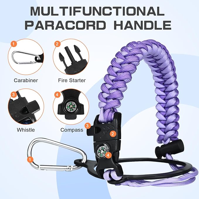 - Full-function Paracord - With brilliant matching colors brings a touch of youthful vibe to the jugs. As a sturdy survival handle it comes with a carabiner, compass, fire starter and whistle, perfect for your wild adventures.