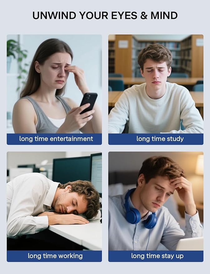 - Maximum Relaxation for Eyes and Temples: This migraine relief massager offers five relaxation modes for rejuvenation after long hours of work or study, effectively help you with migraine relief. And the extended eye mask cushion offers comprehensive coverage to your temples, enveloping your eyes and temples in soothing comfort.【Notice】We do not recommend use of eye machines for customers who have undergone eye operation, retina condition, cataract, glaucoma