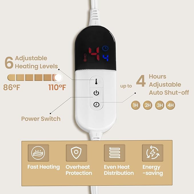 - 6 Customizable Heating Levels: Tailor your warmth to perfection with 6 customizable heating levels. Whether you crave gentle warmth or crave a toastier sensation, this blanket caters to your every desire, making your experience truly bespoke.