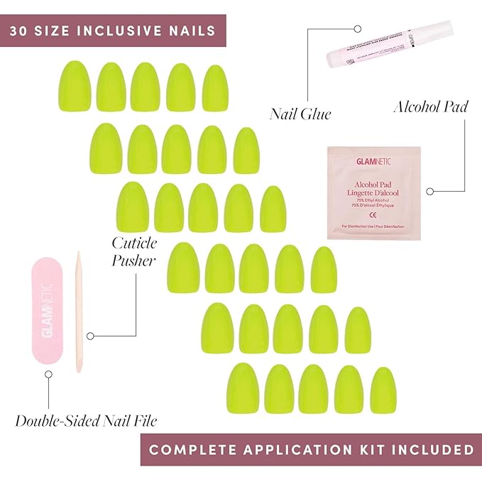 Glamnetic Press On Nails - Lime Green | Opaque Bright Neon Green Short Oval Fake Nails, Salon Quality | 15 Sizes - 30 Nail Kit