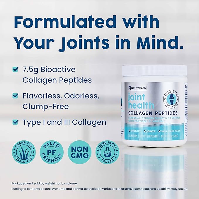 NativePath Joint Health Advanced Formula, Type 1 & 3 Peptides with Fortigel & Verisol, Grass-Fed Unflavored Collagen for Women & Men, 30 Servings