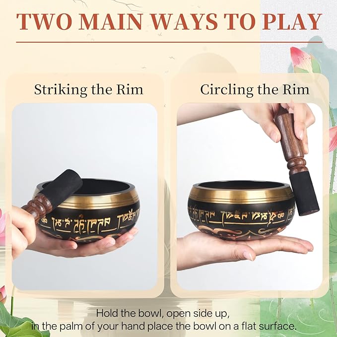 - How to Play: Designed to accommodate practitioners at all skill levels, this singing bowl’s versatility allows you to effortlessly play its fundamental tone with the suede-padded end of the mallet or explore its overtone with the wooden end. Its rich and calming resonance makes it an indispensable tool for meditation and sound healing practices.