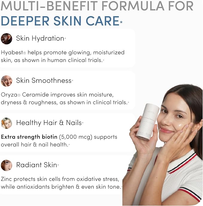 GLOW Anti Aging Supplement - Hyabest® Hyaluronic Acid, Phytoceramides, 5000 mcg Biotin, Vitamin A, C, E, Zinc - Hair Skin Nails Vitamins for Women & Men - Wrinkles & Skin Hydration - 60 Capsules