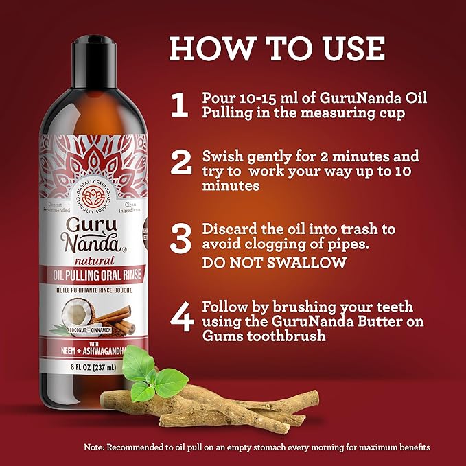 - GuruNanda Ashwagandha Oil Pulling (8 fl oz) is a fusion of natural oils & herbs that embraces the ancient practice of Ayurvedic oil pulling in a modern form, it is a holistic approach to oral wellness.