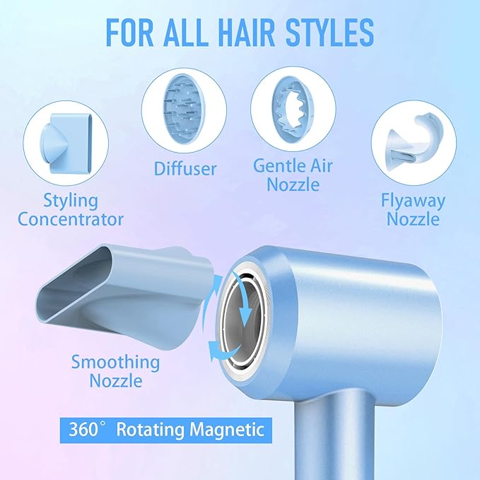 - 【5 Magnetic Attachments for Versatile Styling】The USKOWO blow dryer comes with 5 attachments - a smoothing nozzle, a styling concentrator, a diffuserr,a Gentle air nozzle and a flyaway nozzle,Be it curly,straight,thin or thick hair style, precisely meet the needs of all the hair styles.